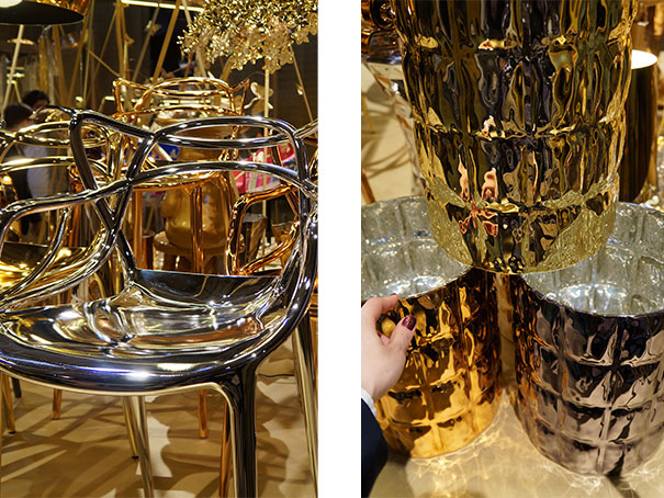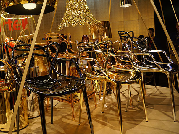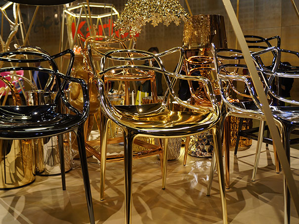A Kartell (marca que fabrica a cadeira) lançou a Masters em metal ouro, cromado, titânio e cobre. Foi paixão à primeira vista quando vi na feira. Separei algumas imagens para mostrar aqui.As versões coloridas são opções bem legais para dar um ar descolado e descontraído na decoração. E por incrível que pareça, o preço é razoável, em se tratando de uma peça de alto luxo.