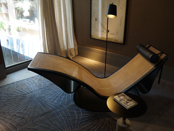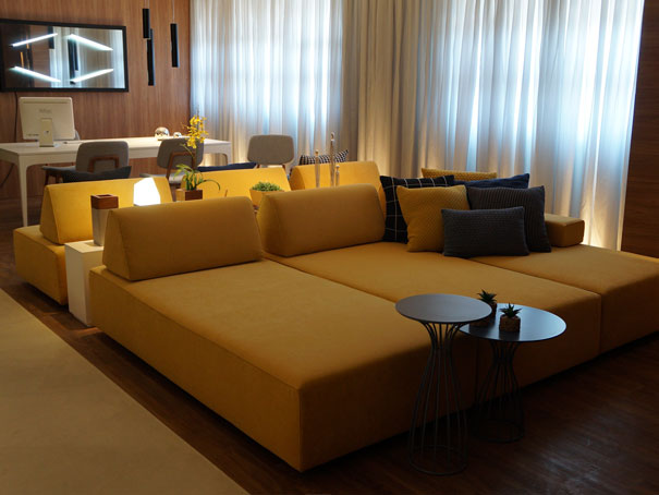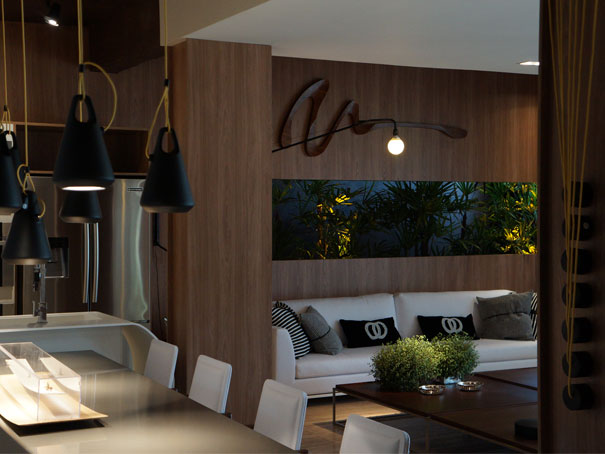 Destaque para o ambiente Someone’s Loft, com uma proposta jovial. O projeto possui 75m2, inspirado em lofts novaiorquinos, com todos os ambientes  integrados, com um cubo separando o quarto das outras áreas.  Duas marcações verticais setorizam o estar da cozinha.O que achei bacana é que a cada ângulo de visão é possível ver uma cor diferente das tiras verticais, vermelho ou prata.