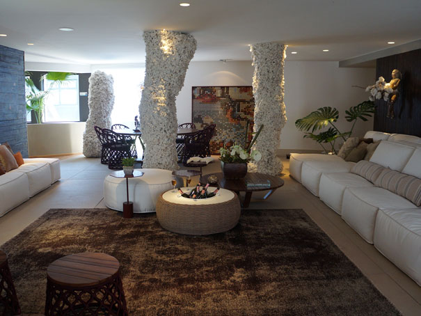 Muitos ambientes com paredes e tetos revestidos em madeira. Marcenaria com madeira em tons de cumaru, freijó, carvalho…A ideia é unificar os planos tornando o ambiente mais acolhedor. É uma tendência. Muita obra de arte em todos os ambientes e mobiliário de qualidade.