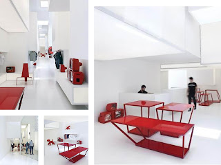 Loja PuraMania, projetado por Guilherme Torres, espaço continuo com a escolha do branco e destaque do relevo dos objetos com a cor vermelha.