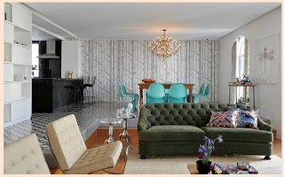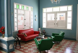 Acima, uma sala bem charmosa e ousada na mistura das cores.