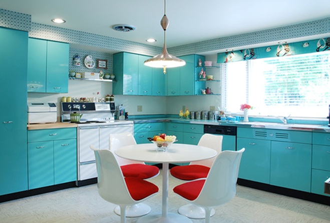 Esta cozinha mais moderninha com mesas e cadeiras Tulipa. E amários azuis. Lembra o estilo das cozinhas americanas da década de 50. ( Confira o post: Especial Cozinhas)