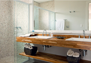Acima, a madeira Teca utilizada no banheiro como bancada, projeto da Ana Karina Abud. Gosto muito do efeito da Teca e louças brancas.