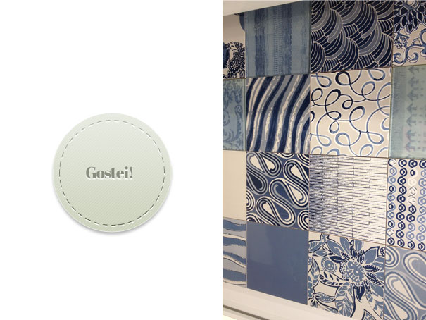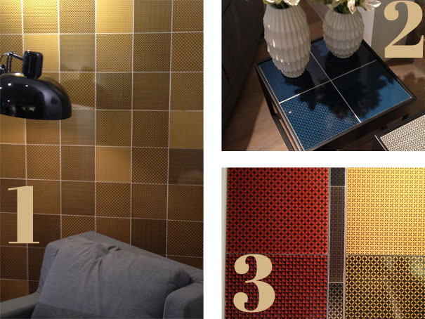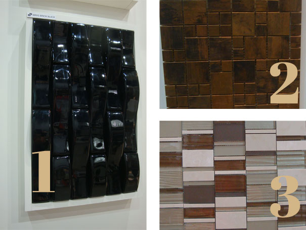 No stand da Porto Design, olha que legal essas placas com alto relevo(1). Vi que eles continuam investindo nas pastilhas escovadas com placas de diferentes tamanhos(2).Interessante esta placa de pastilha com diferentes cores, espessuras e materiais(3).