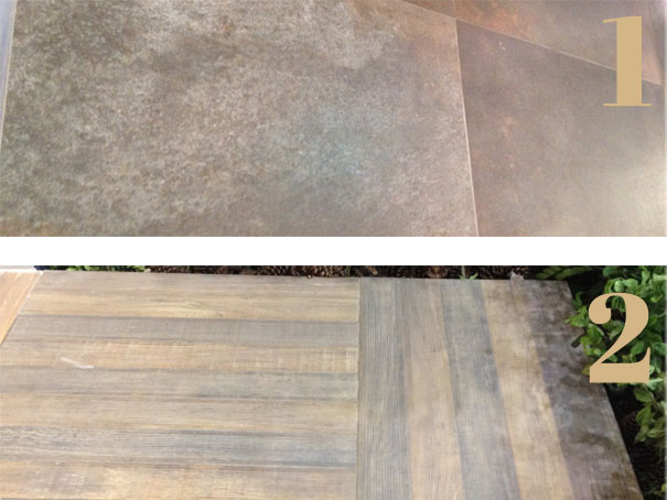 Além das cores, também vi alguns revestimentos interessantes como este porcelanato Steel (1) que lembra aço corten (imagem abaixo). Para área externa este porcelanato Super Deck (2)com certa textura antiderrapante.
