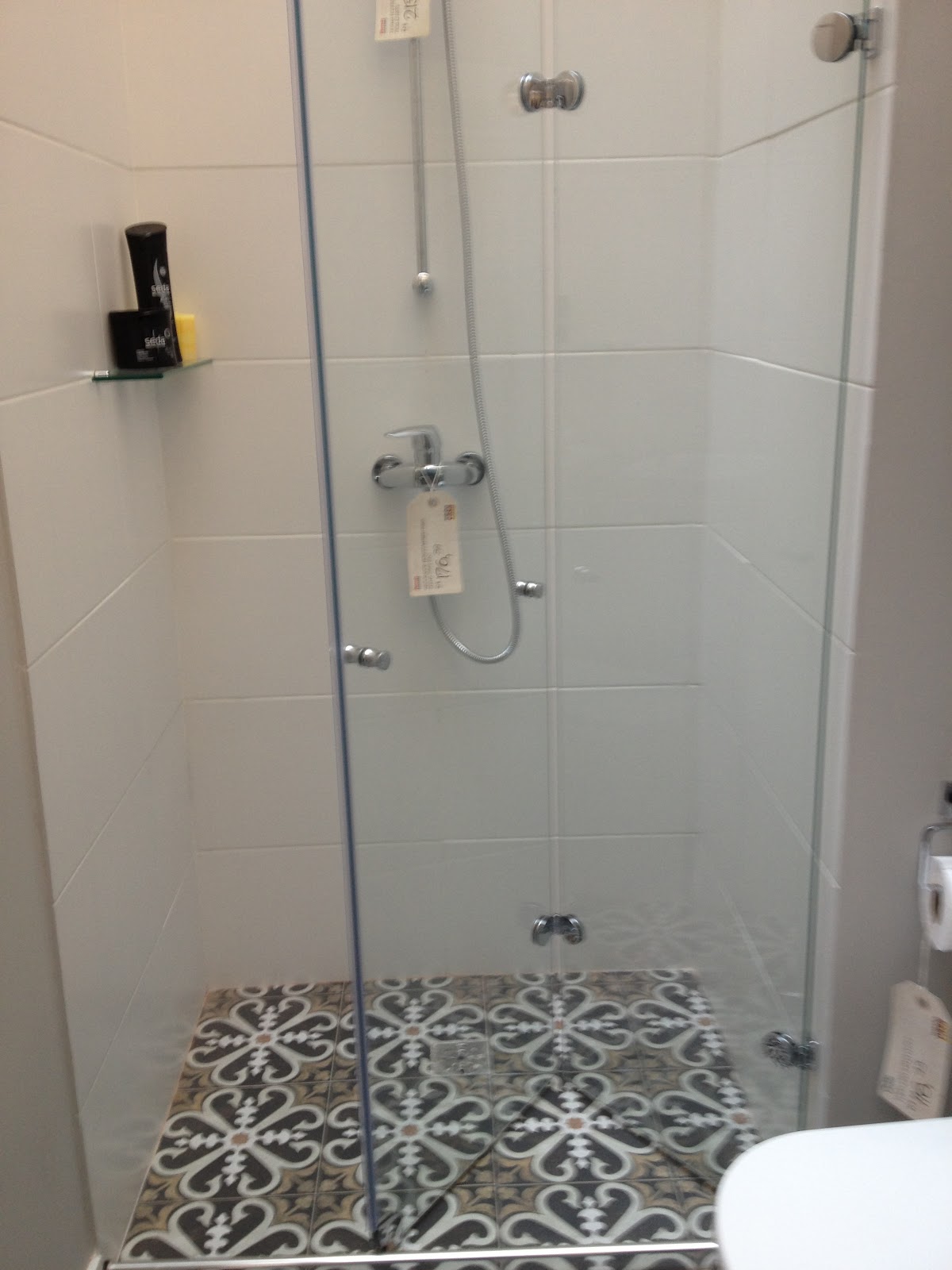 Gostei do contraste do ladrilho com as cerâmicas brancas. Mas o que me chamou a atenção foi a abertura do box com porta tipo “camarão”. Ótima solução para espaços pequenos.