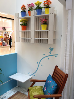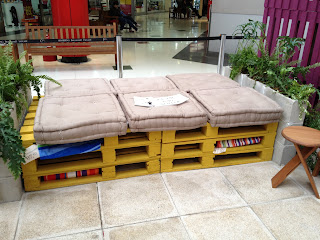 Mais paletes coloridos servindo de mobiliário. Boa solução para varandas.