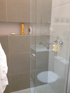 Gostei da opção da cerâmica com um tom mais escuro dentro do box. A solução de nicho é a ideal para box com espaços pequenos.