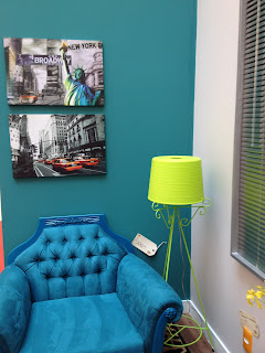 Um cantinho bem aconchegante, com a parede turquesa e quadros de Nyc. Adorei a poltrona azul também, que ficou harmônica com o abajur verde limão.