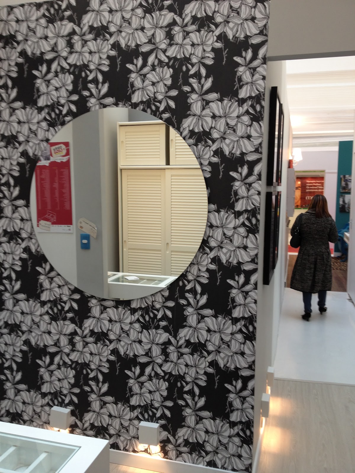 Mais uma vez aqui no blog,  papel de parede Bobinex, da coleção Origem. Adoro espelhos redondos. As arandelas, próximas ao rodapé, oferecem um charme para a circulação.