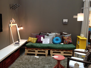 A mistura de cores das estampas e almofodas deixou o espaço muito legal. Gostei da idéia de aproveitar caixotes plásticos e sofás de paletes.