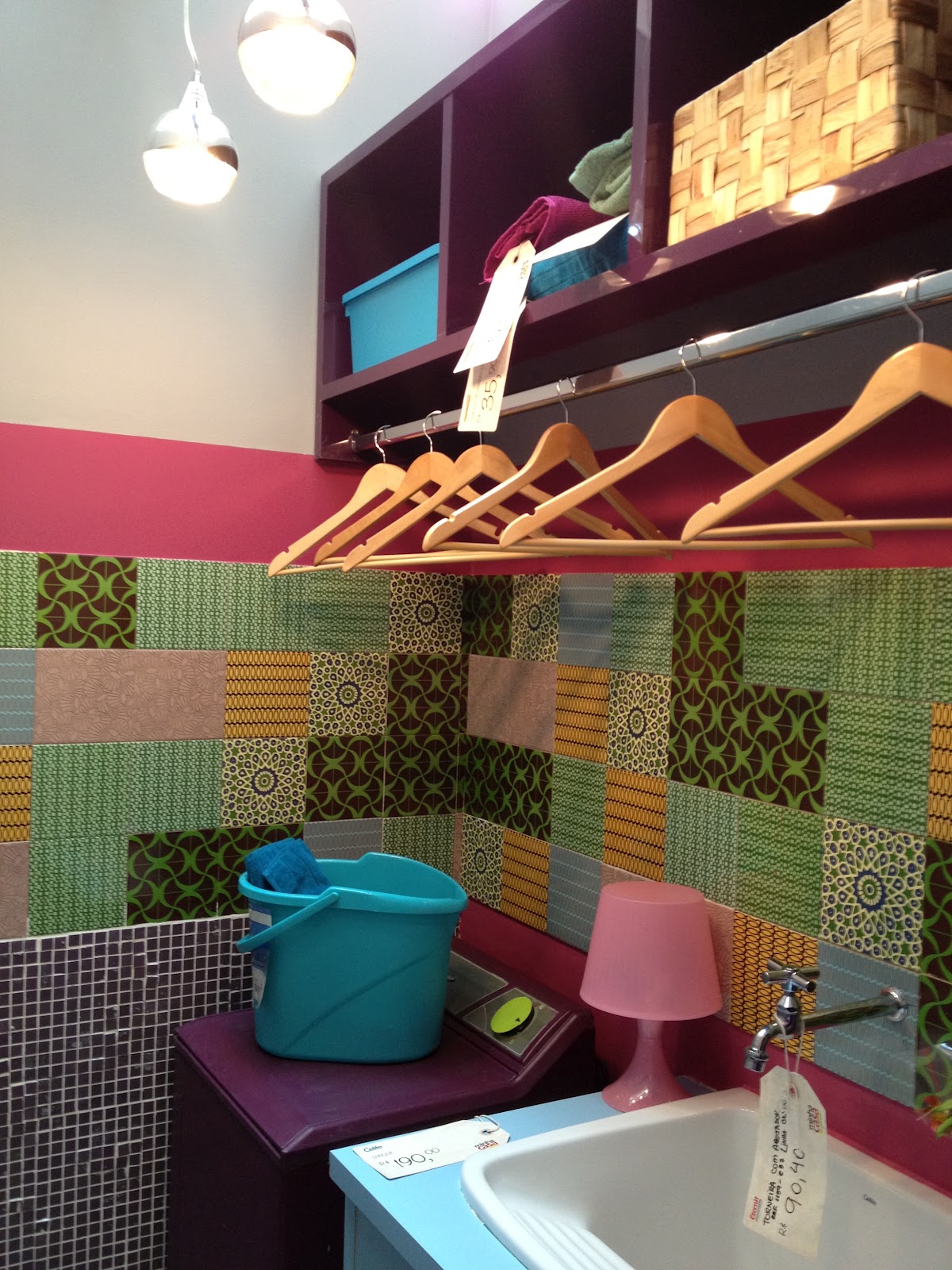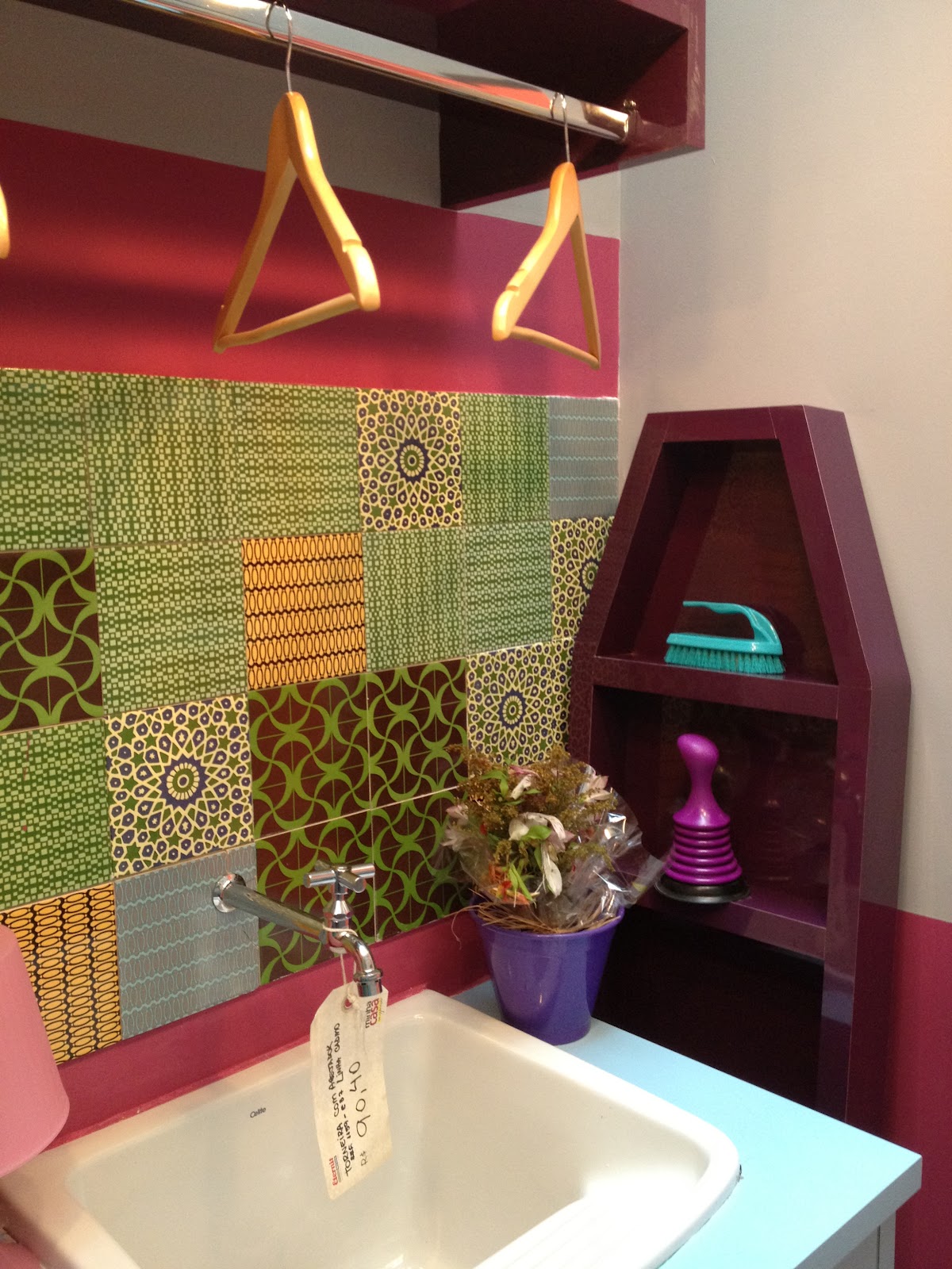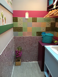 Mais uma vez a idéia que lavanderia não precisa ser branca! Gostei dos azulejos coloridos e da bancada do tanque em azul claro. Ficou muito charmosa.