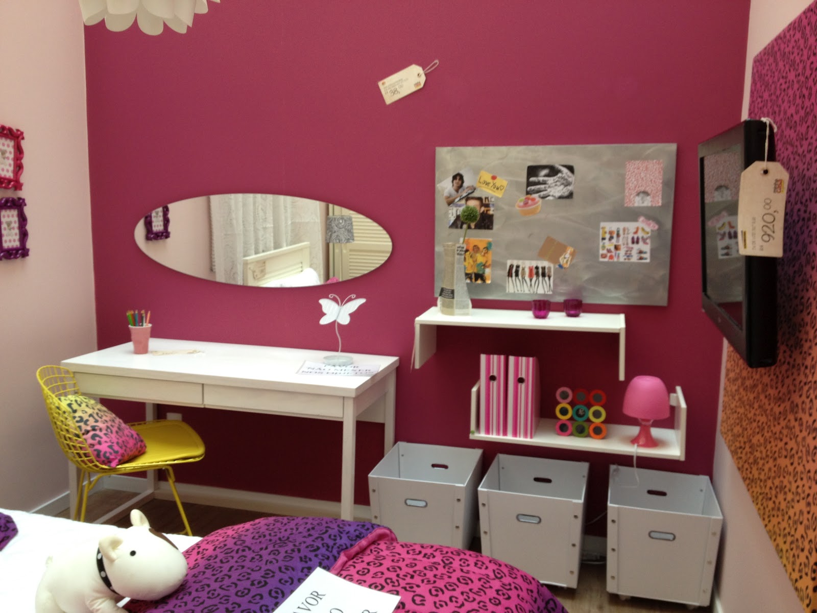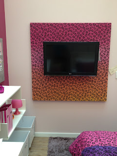O mesmo tecido da colcha da cama foi utilizado para o painel da televisão. Fica um quarto bem colorido.