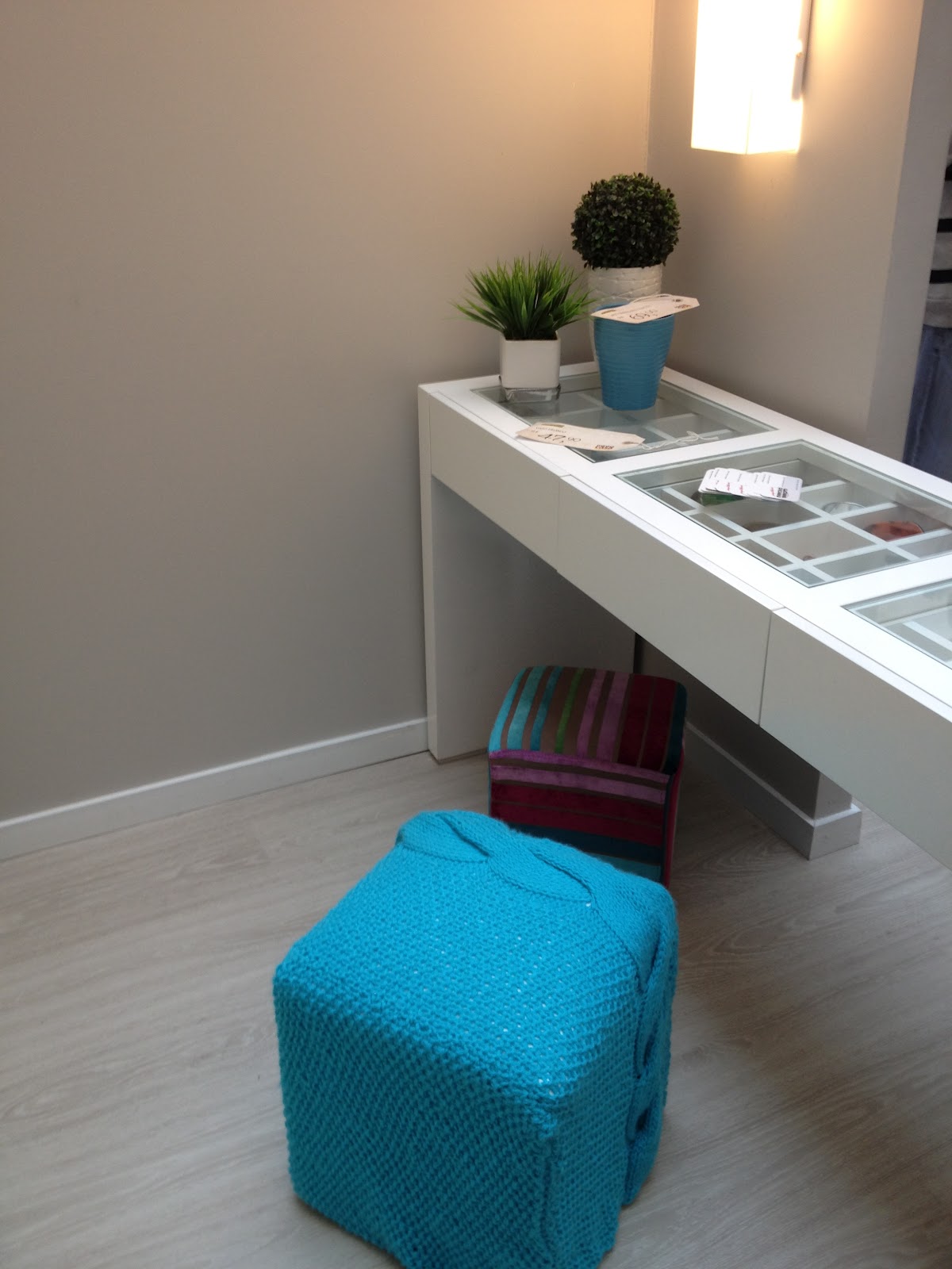 Bem charmosa a mesa com nichos para bijuterias. Detalhe do puff com capa de tricô azul.