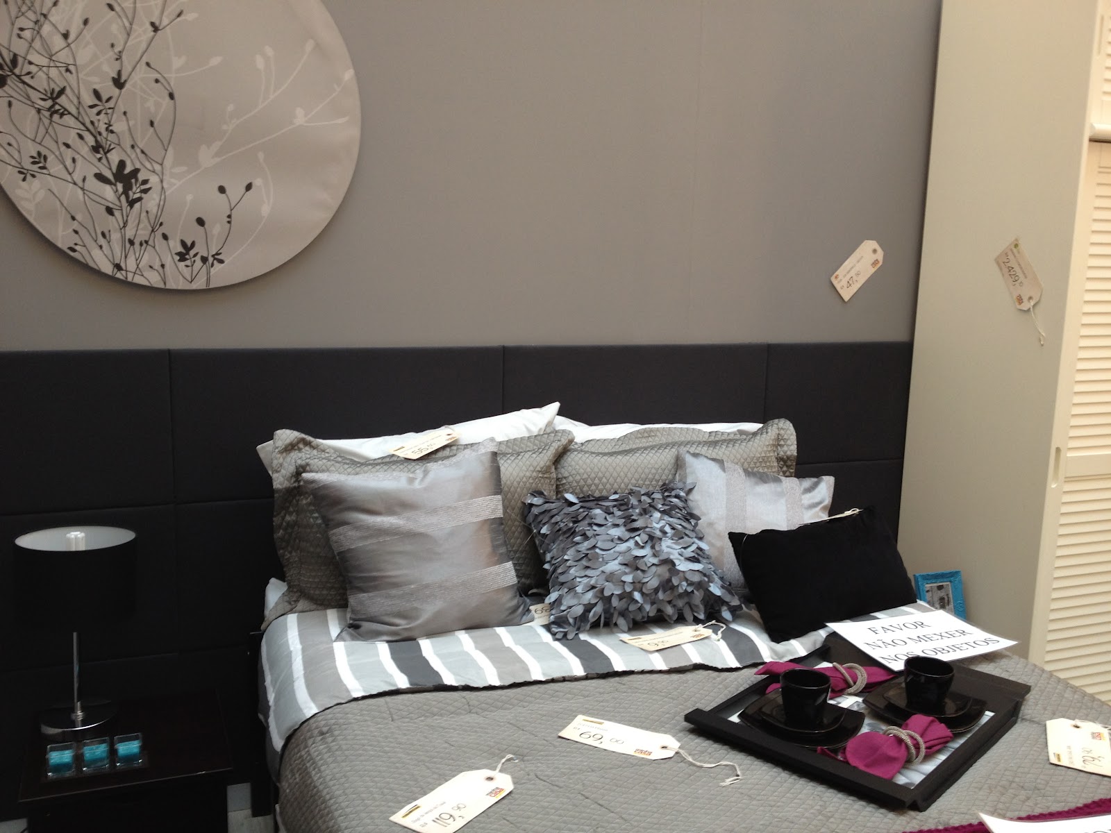Mais uma vez a presença da cor cinza no espaço. Gostei da cabeceira em mdf com tecido cinza chumbo, deixando o espaço mais elegante.