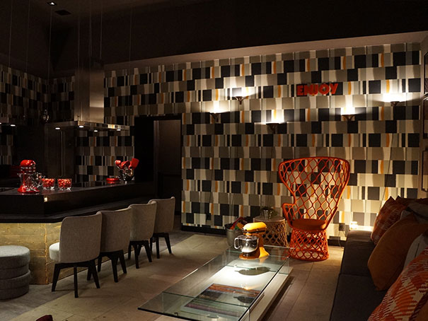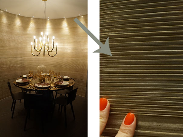 Vários materiais me chamaram atenção, que  lembram matérias-primas como madeira, fibra… Na verdade, são papéis de madeira, porcelanato e outros. Achei muito rico os papéis de parede e fiquei encantada com as opções em alto relevo.