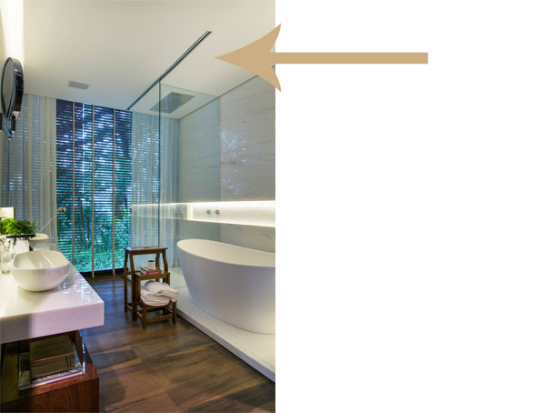Mas para os minimalistas, cabe o uso do vidro fixo como solução. Ele não possui nenhum sistema por não ter que se deslocar, com isso o box passa despercebido na arquitetura.